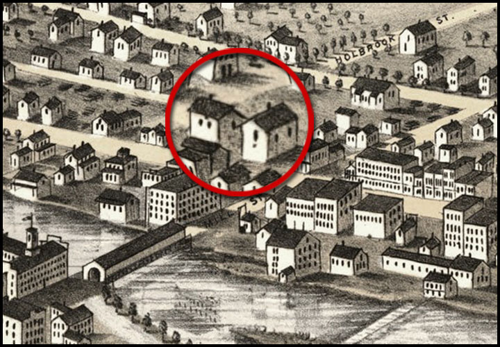 No photographs have been found to exist showing the building during the 1800s. The only glimpse we have of the building's original design comes from this 1867 aerial view map.