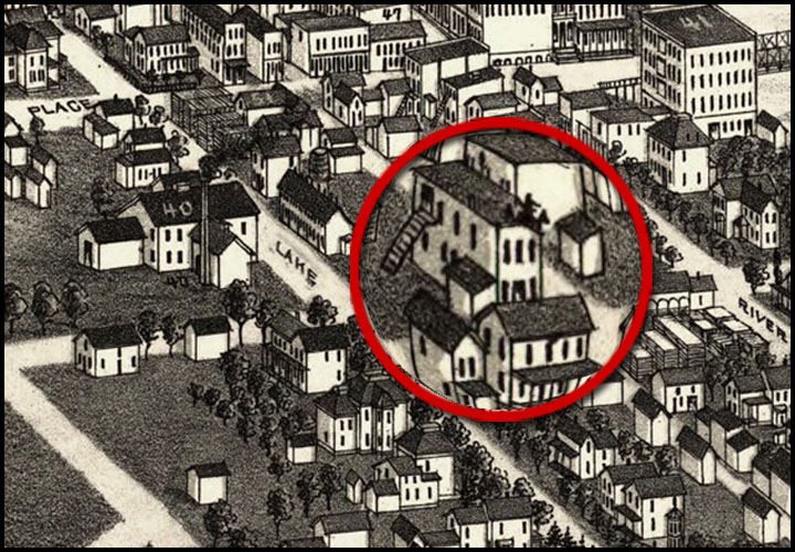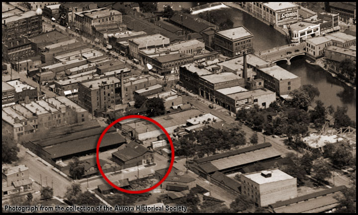 • The 1882 aerial view map of Aurora clearly shows the building. The large two- dimensional trade sign